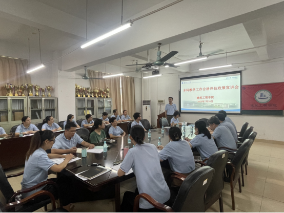 7月18日,建筑工程学院在9栋306召开本科教学工作合格评估政策宣讲会,副校长张世梅、评建办常务副主任陈英征作评建工作专题报告,学院全体教职工参会,会议由吴炎海院长主持。
