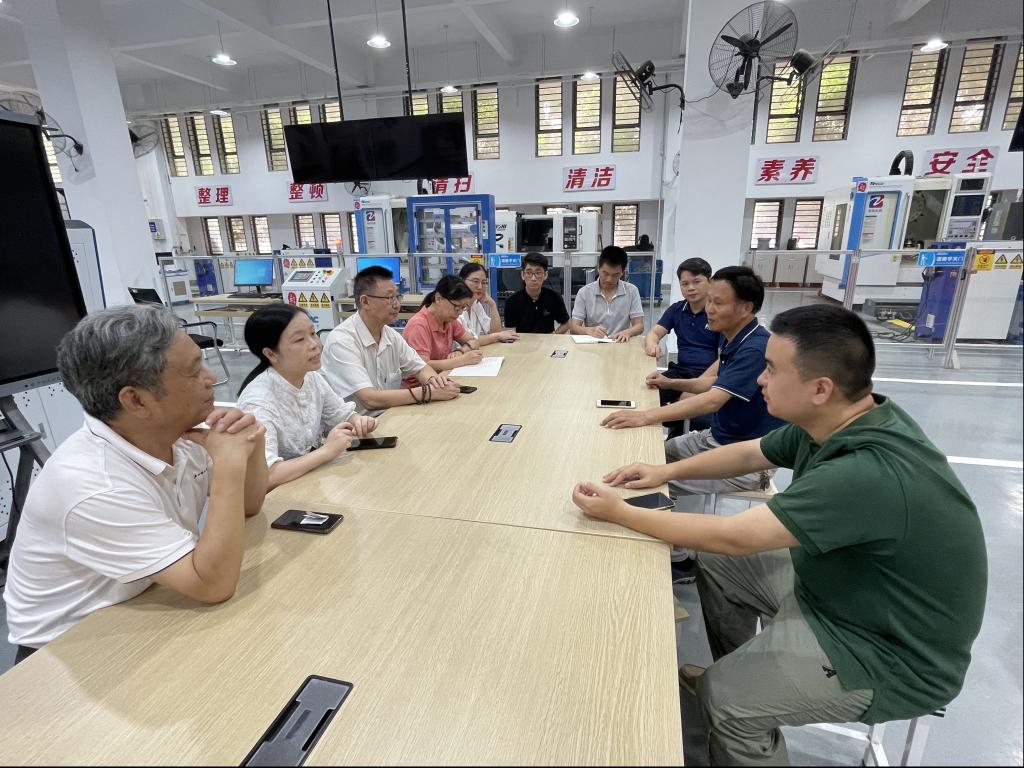 本次调研在文华学院智能制造工程实训创新中心现场展开,中心主任冯天麟教授、副主任唐嘉栋老师与评建工作小组成员进行了经验交流座谈,并参观了创新中心。