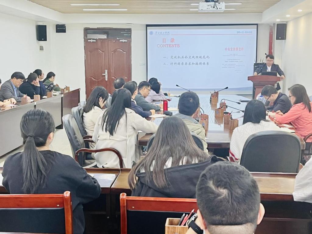黄菲青主任主要聚焦于公文行文规范和评建材料建设。他强调了党政机关公文处理的规范化以及材料辑录和编辑体系的重要性。他强调了公文行文的有关规范要求,并指出了公文行文中常见的错误,要求大家在撰写公文时必须严谨。通过实际案例,他详细讲解了材料汇编的逻辑和体系,强调了工作流程的完整性和工作留痕的重要性,要求与会人员在准备材料时确保材料的原始记录和真实性。
