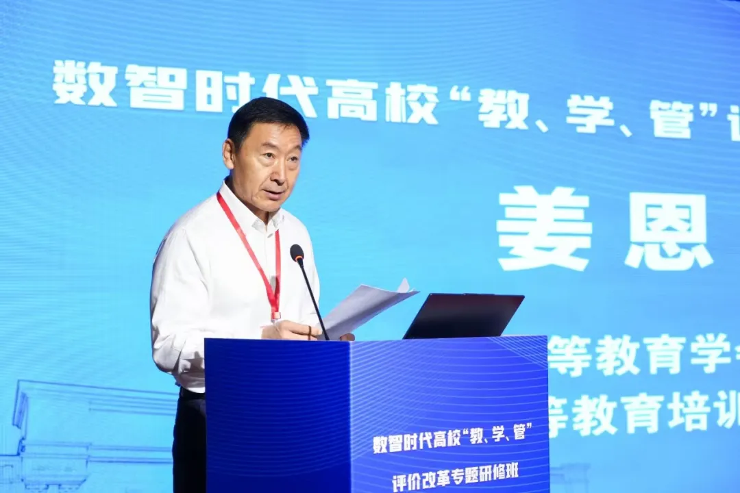 在研修班开篇,中国高等教育学会副会长、中国高等教育培训中心主任姜恩来出席并致辞,从宏观层面阐释了数智时代推动高校“教、学、管”评价改革对建设高等教育强国的重要意义,为研修定下高站位基调。